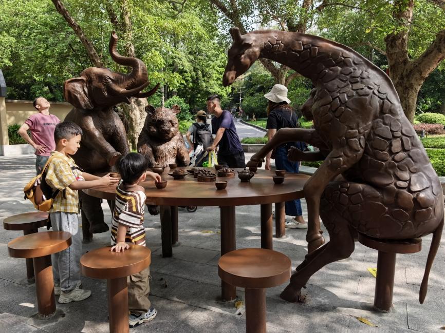 靠近南门,大象、长颈鹿等围坐一团喝早茶的铜雕惟妙惟肖,动物享用着虾饺、烧麦,留有身旁空位仿佛在邀请各方来客一起“饮茶”,感受广府文化。