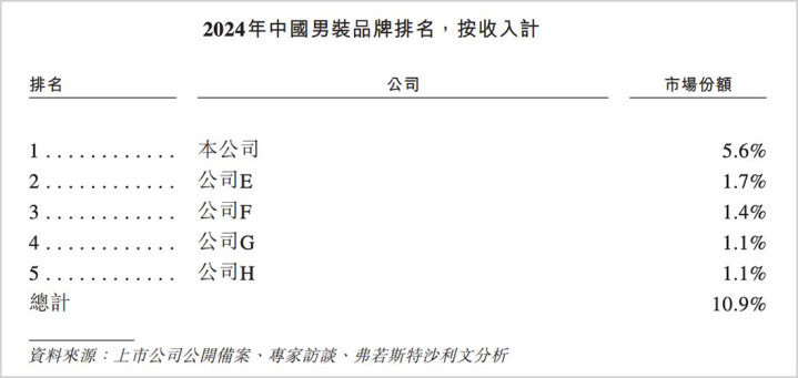 一方面,2022年之后中高端男装销量下滑,低端产品横行的现象较为明显。弗若斯特沙利文数据显示,2024年中国男装品牌前五仅占据市场共10.9%份额,将近90%市场份额分散在大量中小型男装企业中,经营门槛不高、市场集中程度低、消费降级等因素共同催生了更加严重的同质化竞争。
